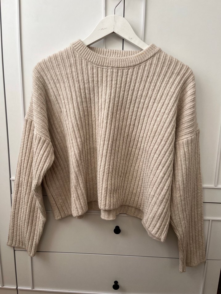 Yumuşak örgü kumaştan, uzun kollu, bisiklet yaka ve salaş kesim bej kadın kazak. Düz tasarımı günlük kullanıma uygundur.