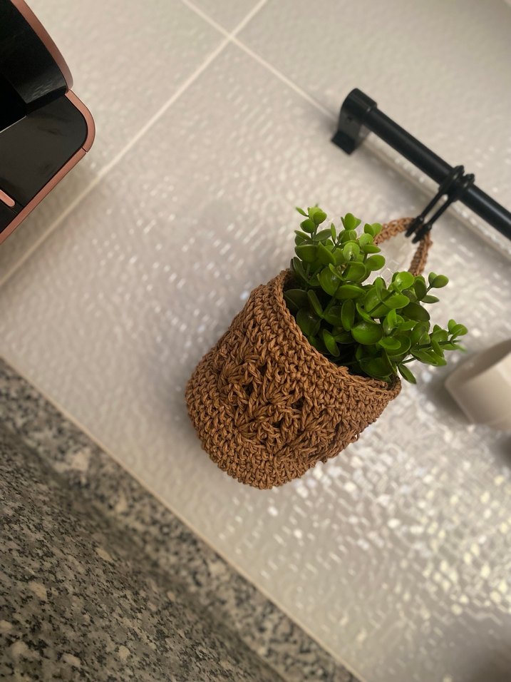Hafif bej renkli, asılabilir örgü sepet. Küçük bitkiler için doğal bir dokunuş sağlar.