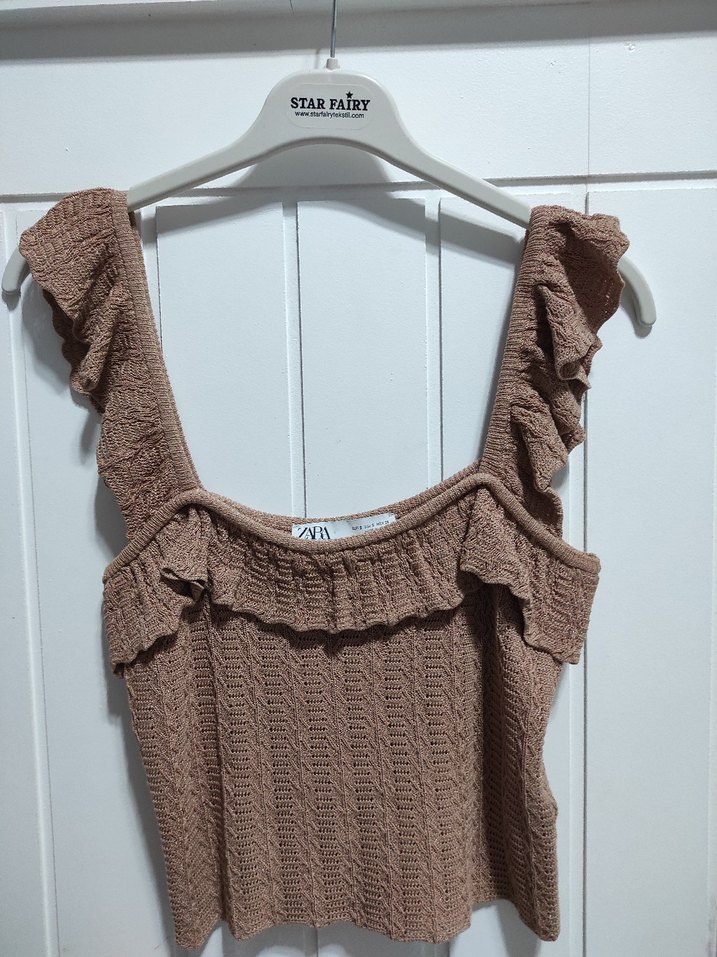Bej renkli, örgü kumaştan yapılmış, straplez ve fırfırlı yakaya sahip, bol kesim. Nakış detaylarıyla bohem ve retro tarzda, rahat bir model.
