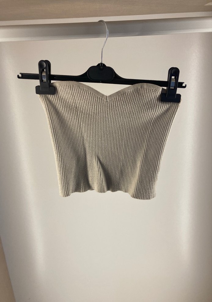 Bej renkli, örgü kumaştan yapılmış, straplez ve ince askılı crop top. Yumuşak yün malzemesiyle kısa ve vücuda oturan kesim sunar.