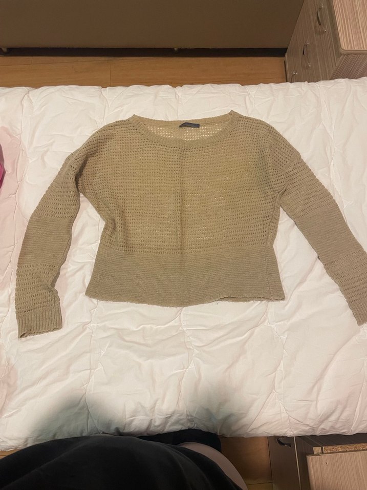 Bej renkli, örgü kumaştan uzun kollu, yuvarlak yakalı, bol kesim ve normal boyda kadın kazak. Günlük sokak stili için uygundur.