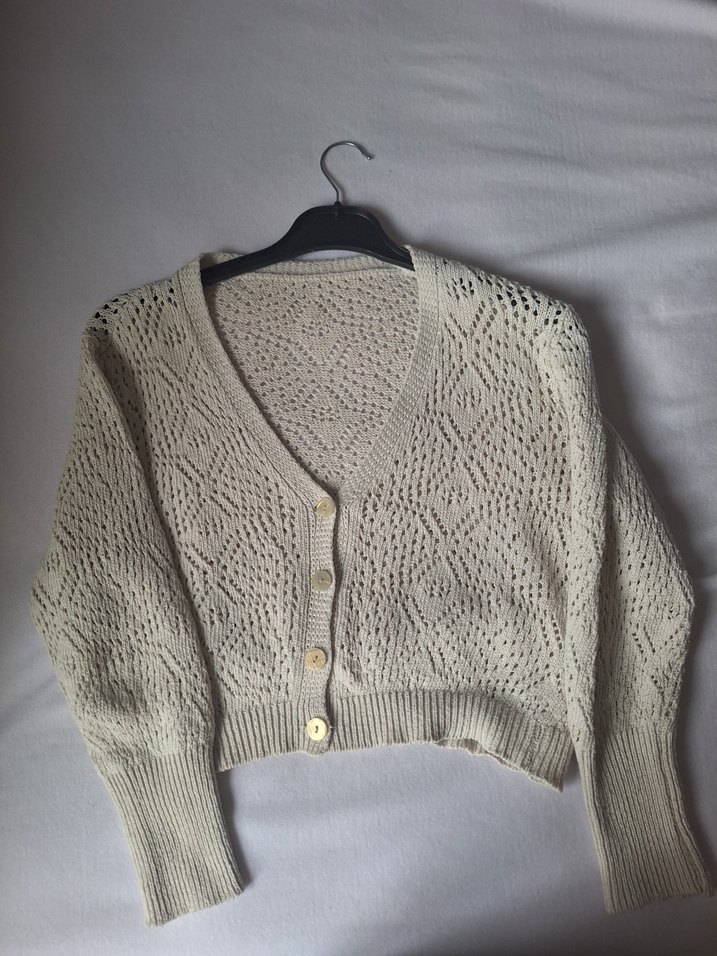 Bej renkli, V yakalı, uzun kollu, bol kesim örgü kadın hırka. Bohem tarzda, midi boyda ve düğmeli. Rahat günlük kullanım için uygundur.