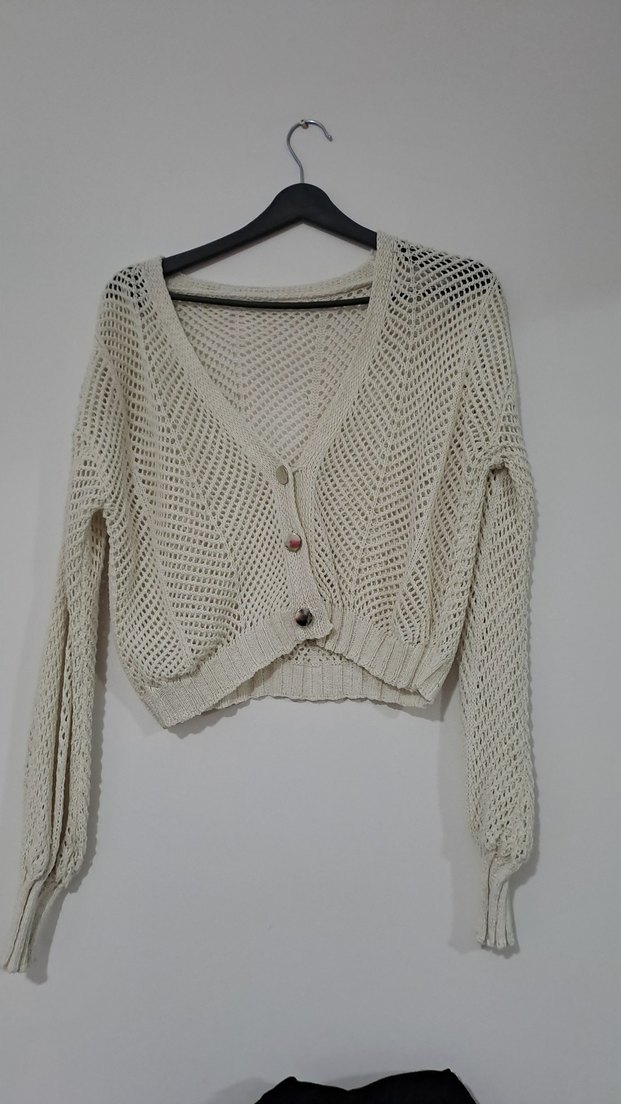 Bej renkli, uzun kollu ve V yakalı örgü kadın hırka, bol kesimi ve kısa boyuyla rahat bohem tarz sunar. Günlük kullanım için uygundur.