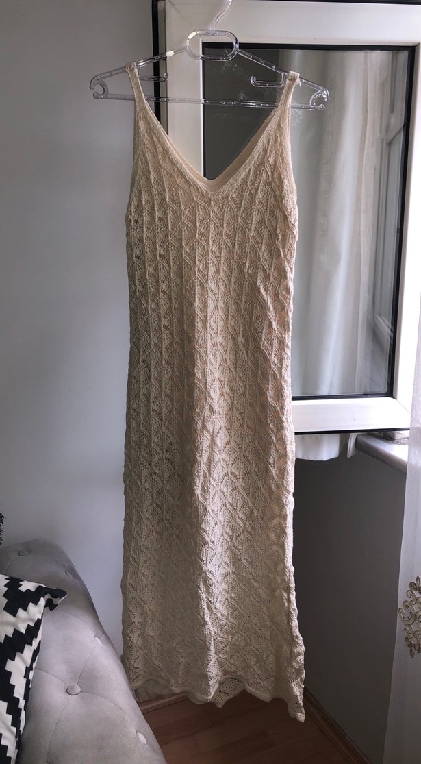 Örgü dokulu, kolsuz, V yakalı ve uzun kesim esnek sahip bej renkli, bohem tarzda rahat bir elbisedir. İçi yarım astarlı temiz ve defosu yoktur