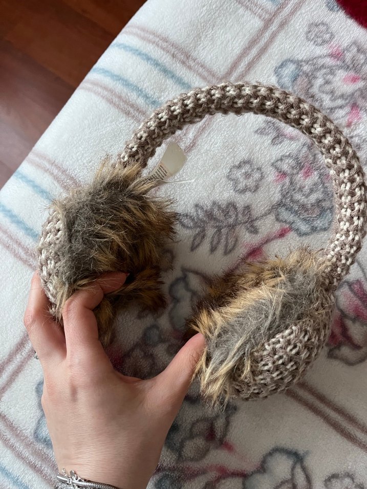 Bej renkli, örgü tasarımlı ve yumuşak kürk detaylı kulaklık, sıcaklık ve konfor sağlar. Gri tonlar tasarımla uyumludur.