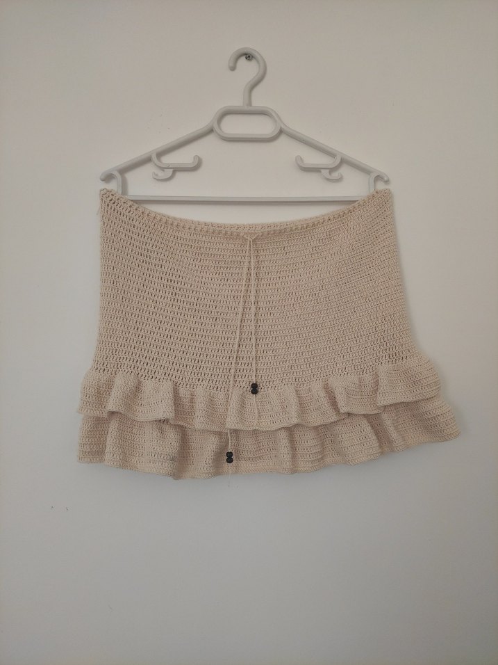 Volan detaylı, rahat kesim bej örgü mini etek. Sıcak ve bohem tarzıyla günlük kullanıma uygun. m L