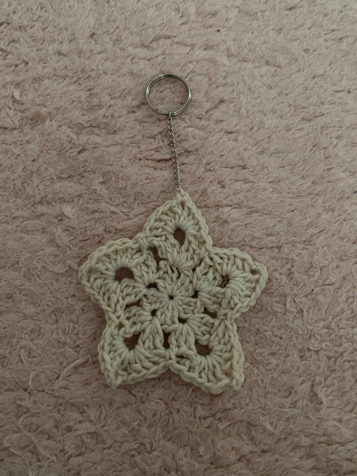 Bej renkli, örgü yıldız şeklinde, rahat ve bohem tarzda anahtarlık. Anahtarlarınıza retro ve pastel bir dokunuş katar.