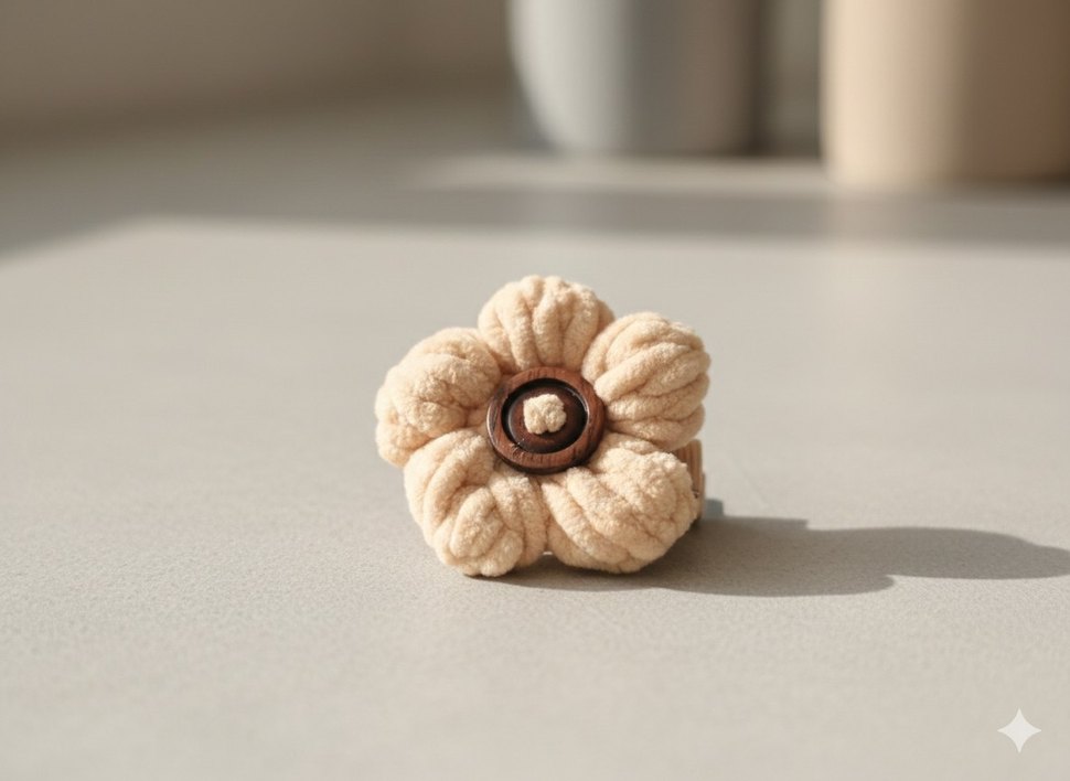 El yapimi, ahşap detaylı bej çiçek şeklinde, yumuşak ve bohem tarzda saç tokası. 7cm