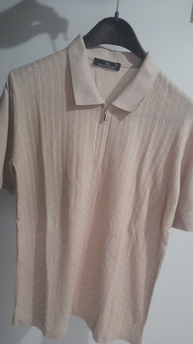 Bej renkli, örgülü dokuda, kısa kollu ve fermuarlı yakaya sahip erkek polo tişörtü. Rahat kesimi ve sentetik kumaşıyla günlük kullanıma uygun.
