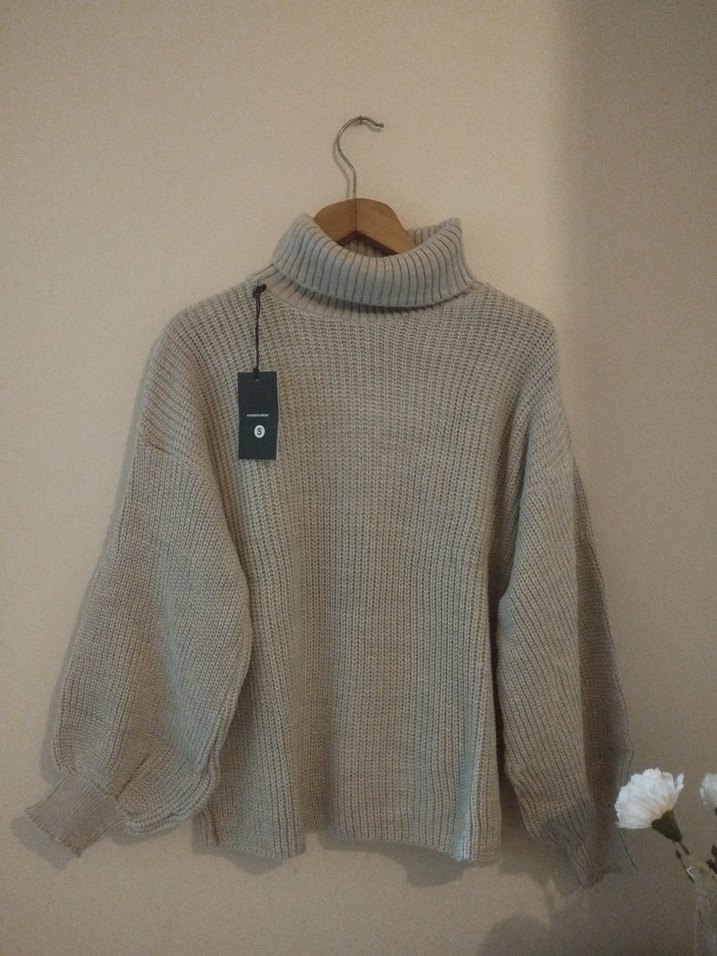 Boğazlı, uzun kollu, bej renk örme kazak, rahat ve günlük kullanıma uygun, bol kesim tarzıyla konfor sağlar.