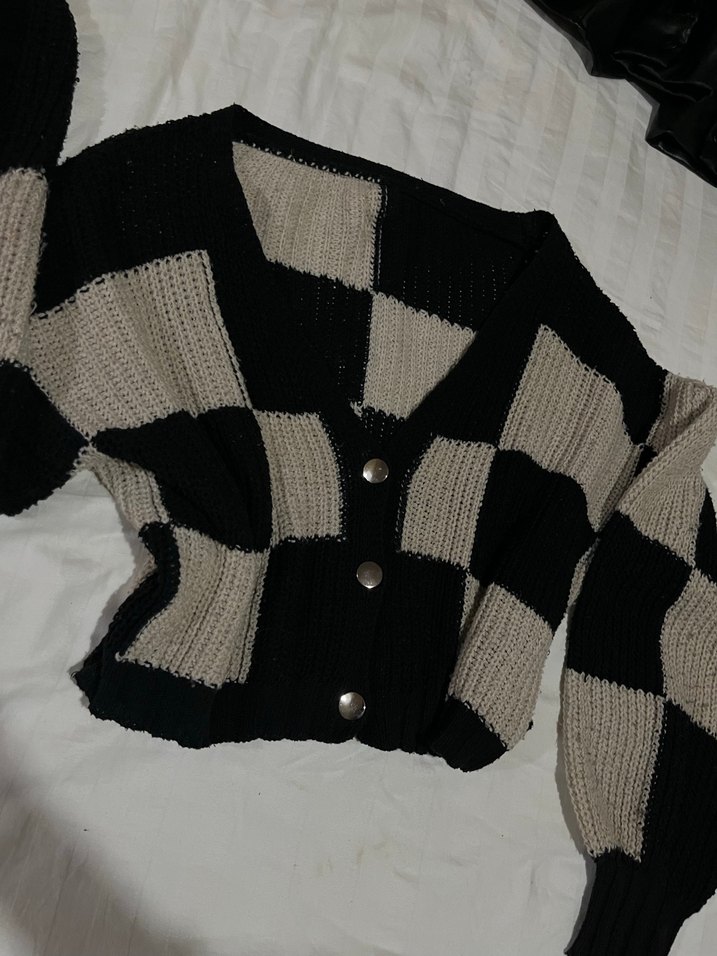 Gri kareli örgü hırka, uzun kollu ve salaş kesimdir. V yaka ve midi boyda, rahat sokak stili için uygundur.