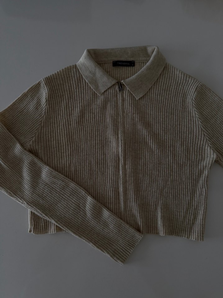 Bej renkli, örme dokulu kadın triko kazak, yakalı ve uzun kollu. Hiç kullanılmadı