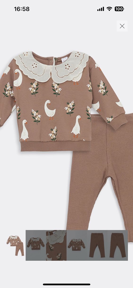 Bej renkli örme kız bebek takımında uzun kollu, ördek ve çiçek desenli baskılı üst ve uyumlu fitilli pantolon bulunur. Üst kısmında fisto detaylı yakası vardır.