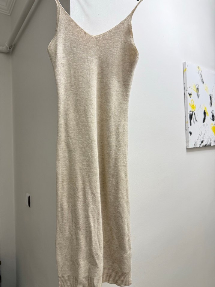 Bej renk, kolsuz ve askılı kesime sahip uzun elbise, yumuşak keten kumaştan örülüdür. Rahat ve bohem tarzıyla günlük kullanıma uygundur.