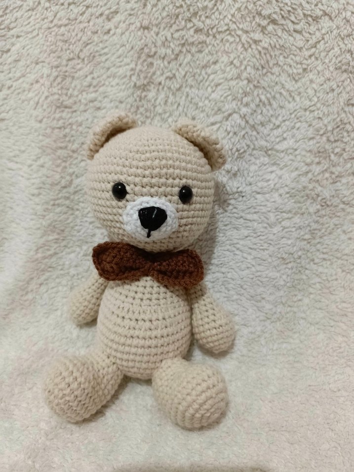 Kahverengi papyonlu bej örme peluş oyuncak ayıcık, yumuşak ve sarılabilir.