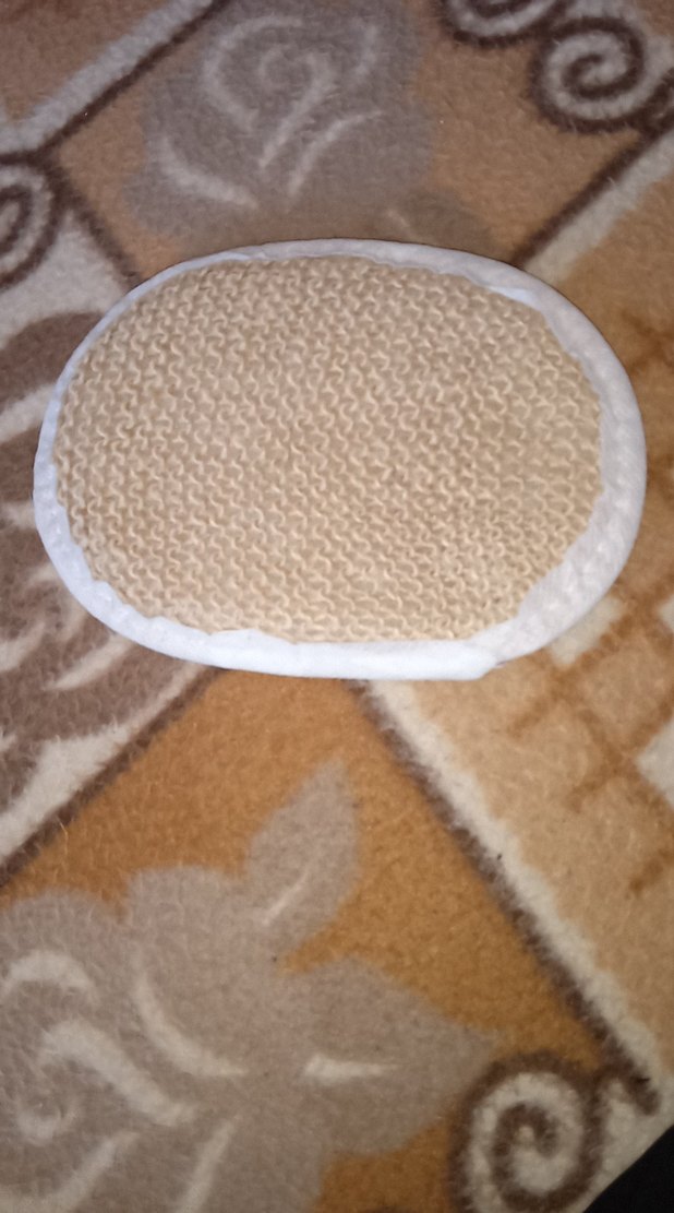 Bej renkte, beyaz kenarlıklı, yumuşak banyo lifi.