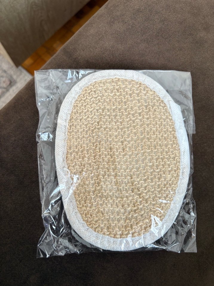 Bej oval banyo süngeri, nazik peeling ve temizlik için dokulu yüzeye sahiptir. Yumuşak ve dayanıklıdır.