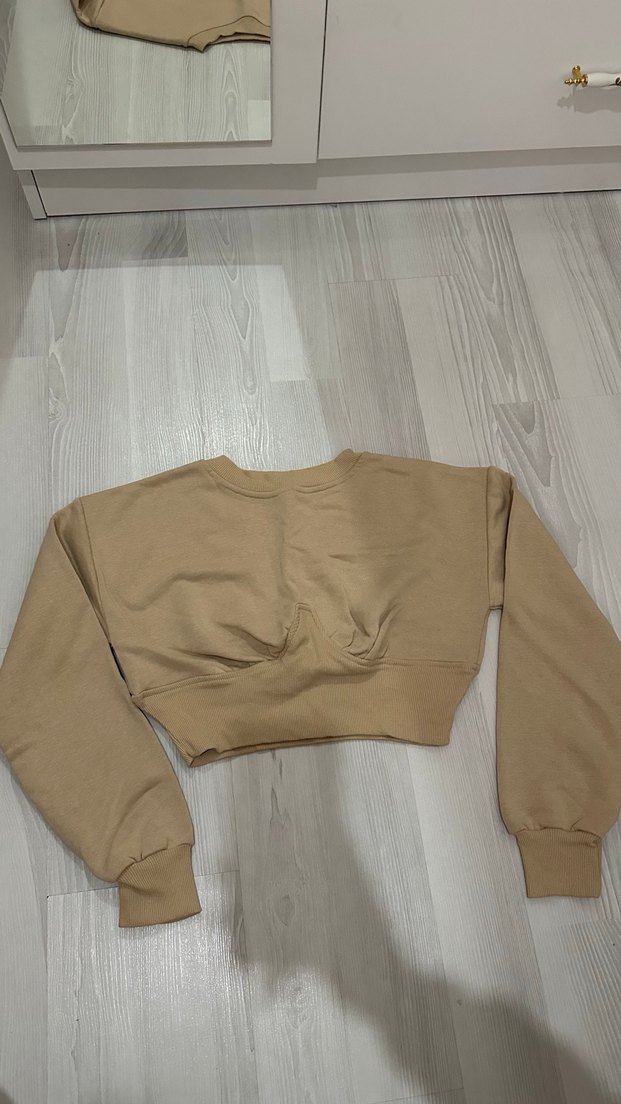 Bej renk, yuvarlak yaka ve uzun kollu, bol kesim keten kumaştan sweatshirt. Desensiz ve pastel tonuyla günlük kullanıma uygun rahat şıklık sunar. ☁️