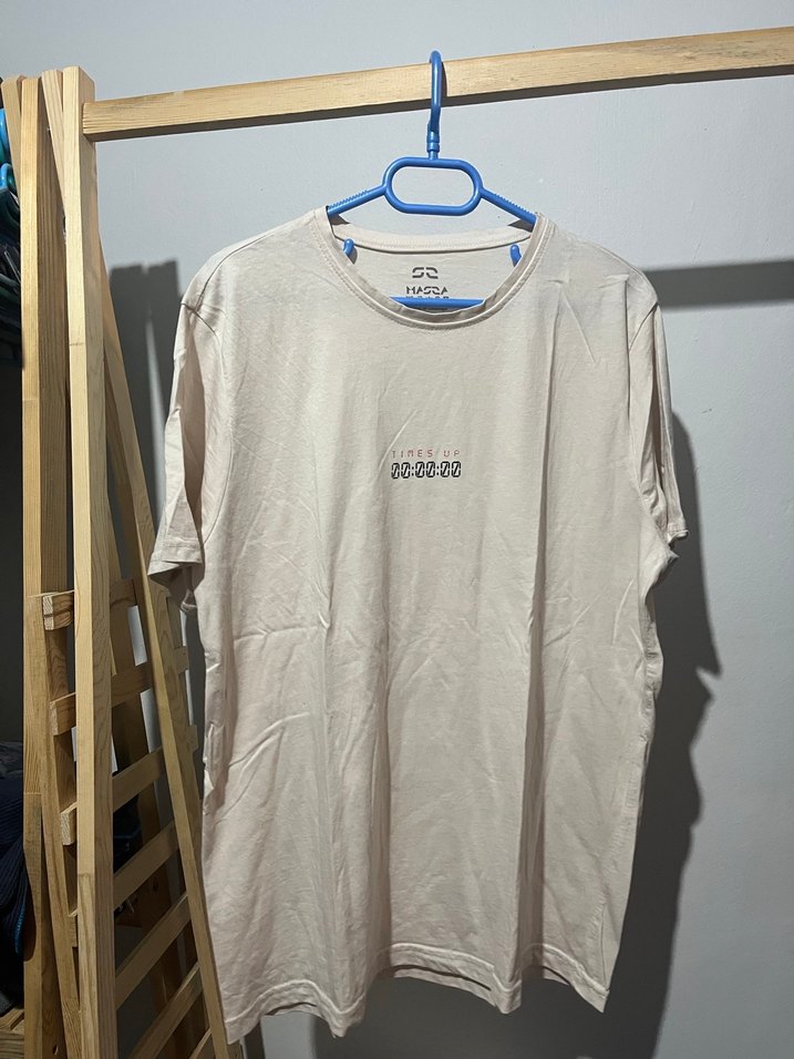 Bej renkte, kısa kollu, yuvarlak yakalı, pamuklu ve oversize kesim erkek tişörtü. Günlük kullanıma uygun rahat bir tasarım.