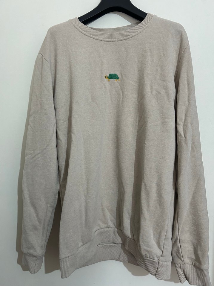 Bej renkte, uzun kollu ve yuvarlak yaka, yumuşak ve sıcak kumaştan oversize kadın sweatshirt. Göğüste küçük yeşil nakış detayı bulunur. Rahat sokak stili için ideal.