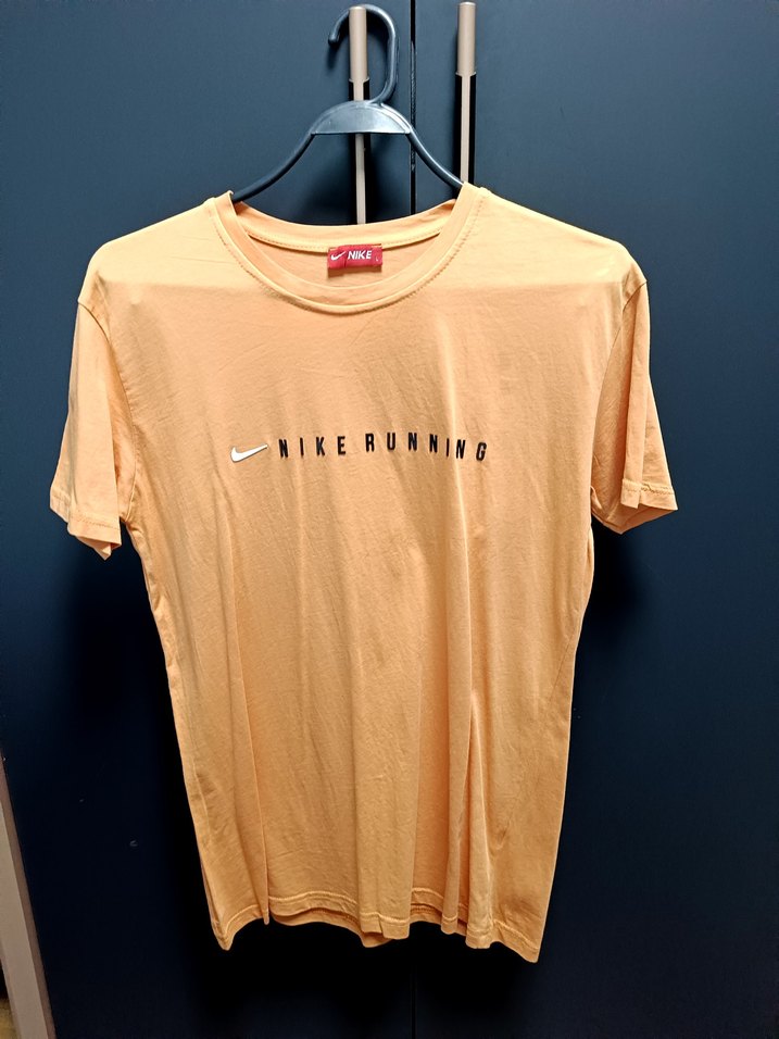 Hafif bej renkte, kısa kollu, yuvarlak yakalı Nike Running tişört. İpeksi kumaştan, bol kesim ve baskılı tasarıma sahip, rahat sokak stili için uygun.