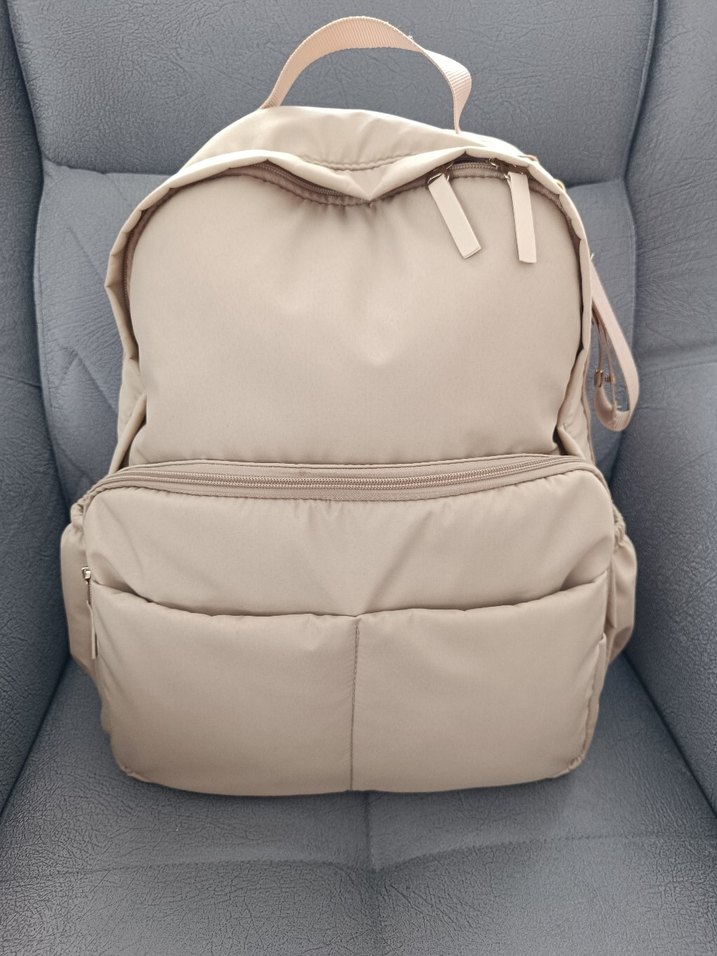 Bej renkli, sentetik kumaştan yapılmış, tokalı kayışlara sahip, minimal ve desensiz tasarımlı günlük kullanıma uygun sırt çantası. sıfırdan farksız hiçbir sorunu yoktur. myroka ven modeli