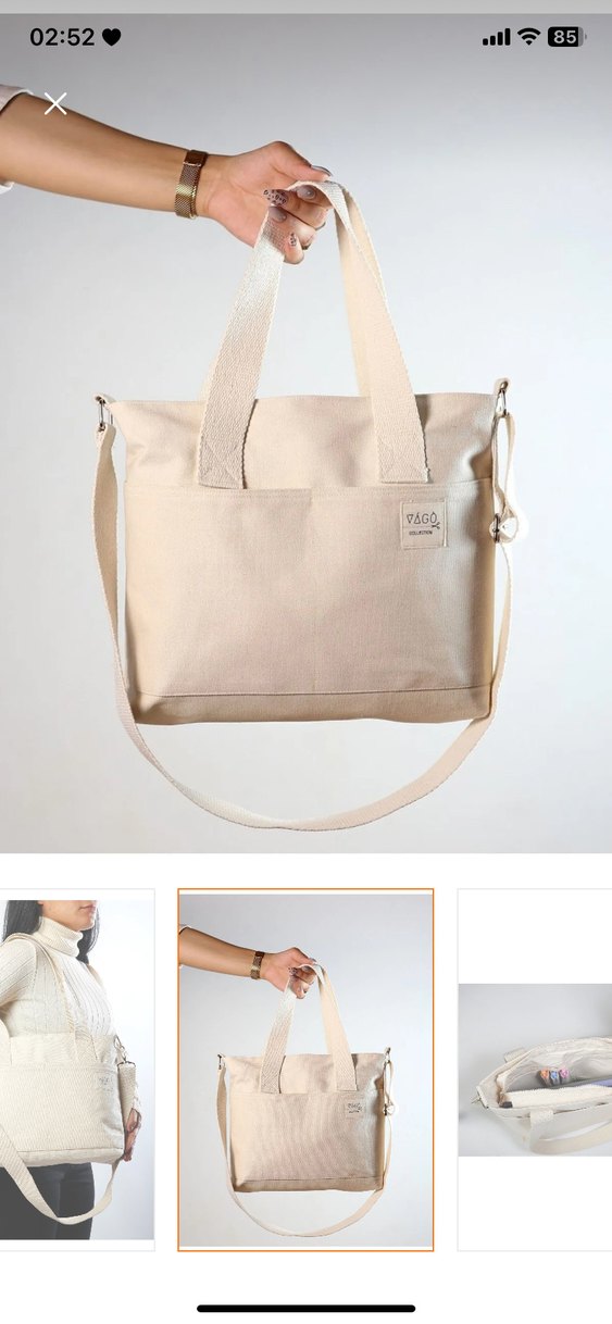 Bej pamuk kumaştan yapılmış, desen içermeyen, elde ve omuzda taşınabilen, günlük kullanıma uygun şık kadın çantası.