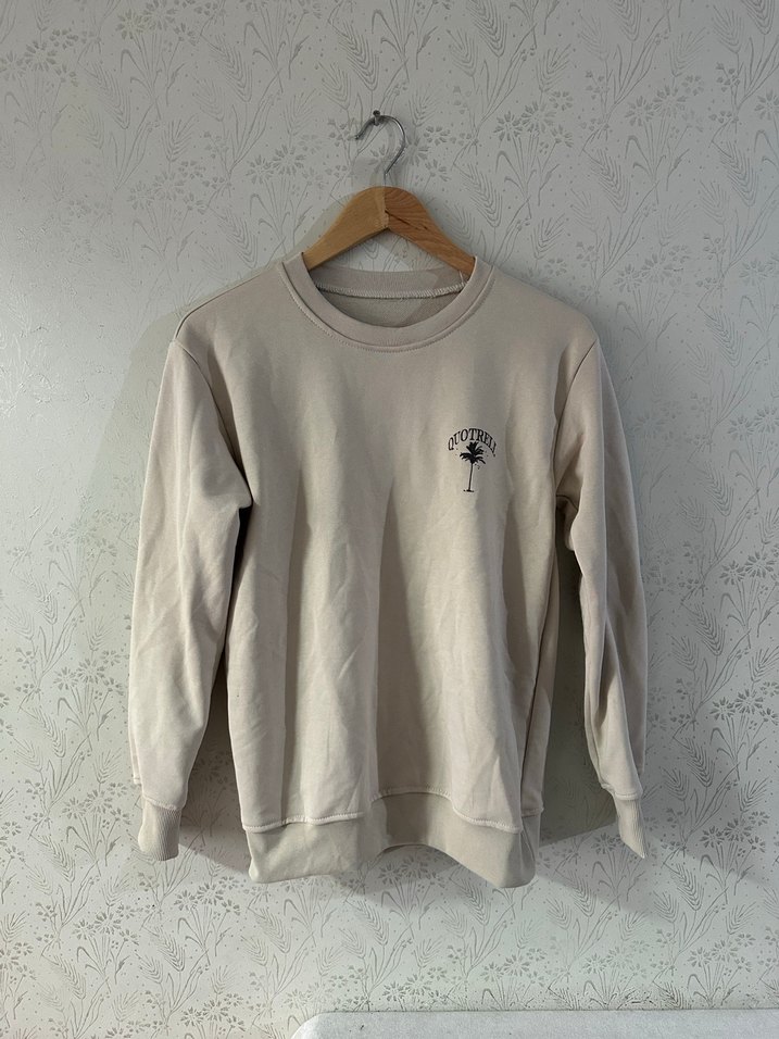 Bej renkli pamuk sweatshirt, yuvarlak yaka ve uzun kolludur. Rahat ve bol kesimiyle günlük kullanıma uygundur, küçük logo detayı vardır.