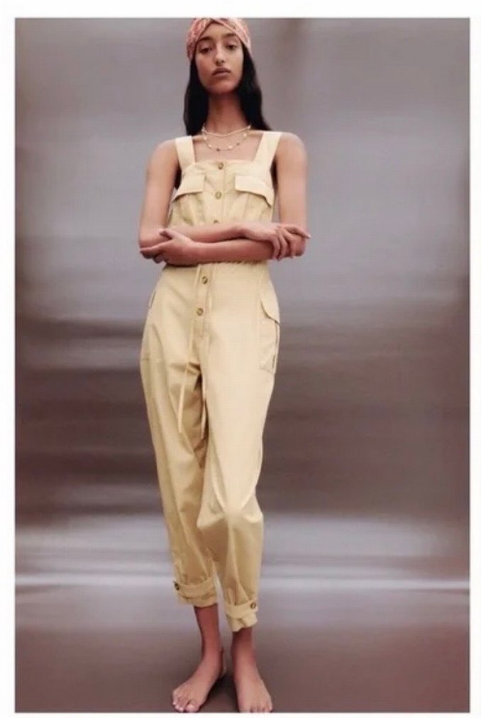 Bej pamuklu kumaştan, askılı ve midi boyda, rahat kesim kadın tulum. Minimalist tarzda, günlük kullanıma uygun, zahmetsiz şıklık sunar.