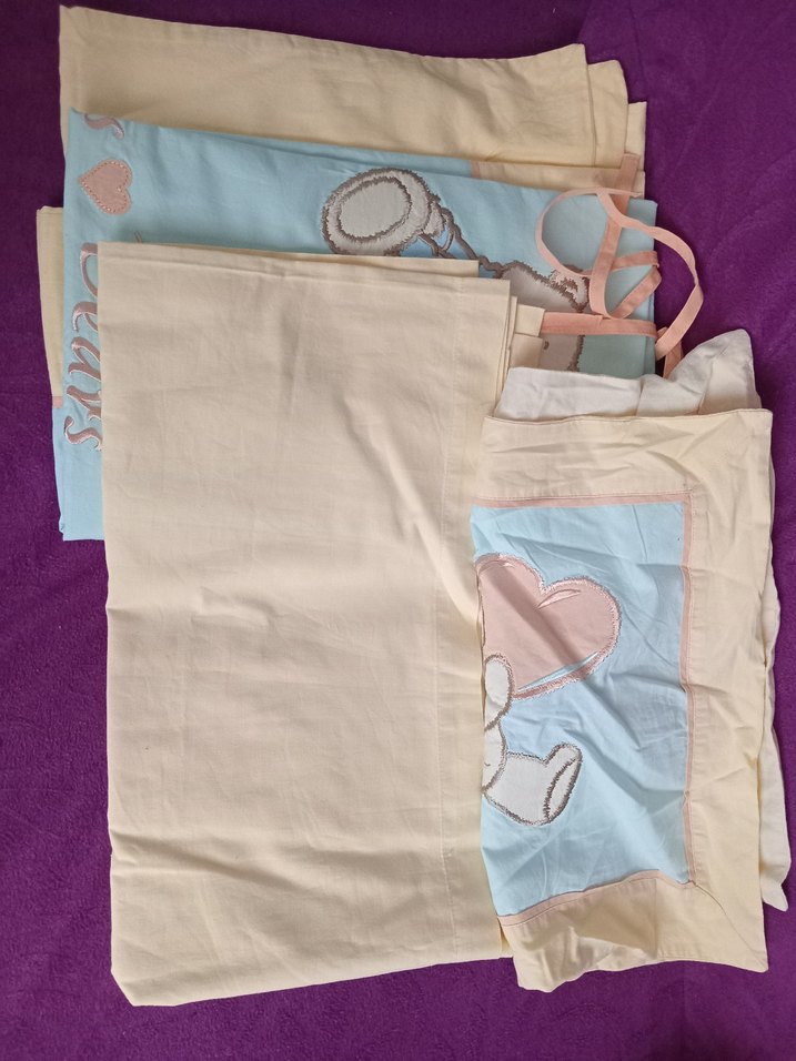 Bej pamuklu bebek uyku seti, pastel renklerde yumuşak ve rahat kumaş içerir. Yastık kılıfı ve nazik desenlerle uyku için uygundur.