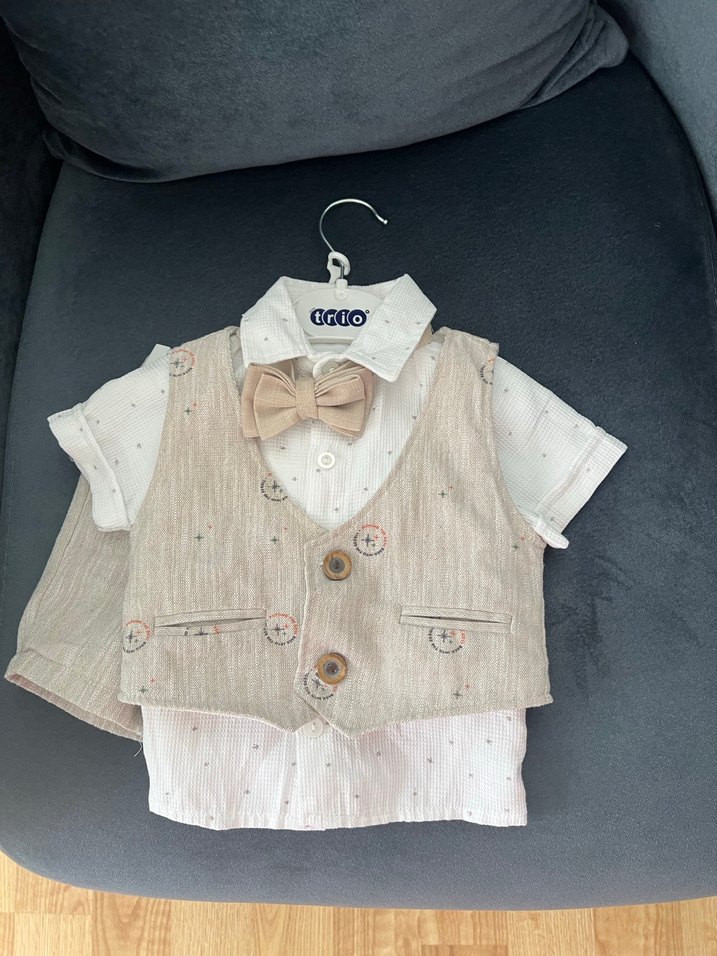 Bej pamuklu, düğmeli yelek, beyaz gömlek ve fiyonk detaylı bebek takımı. Pastel tonlarda, streetwear tarzında rahat bir kombin.