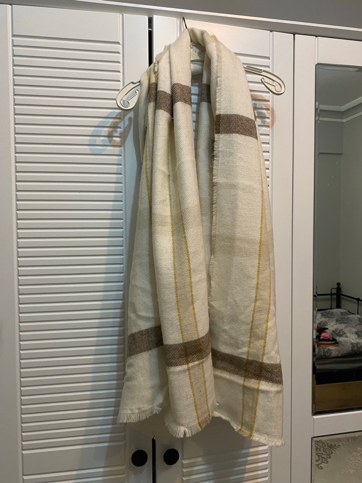 Bej pamuklu kumaştan yapılmış, kahverengi ve sarı çizgili, bohem tarzı ve rahat bir şal. Kullanılmadı.