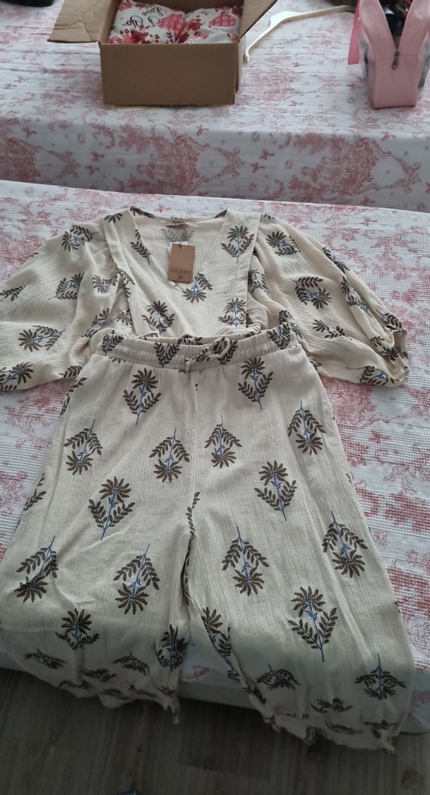 Bej pamuklu ikili takım, bol kesim, uzun kollu ve V yaka detaylıdır. Baskılı desen özellikleriyle bohem tarzını yansıtır. Keten.