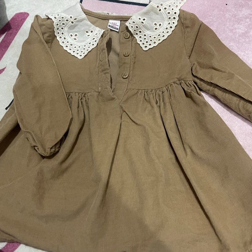 Bej pamuklu, uzun kollu ve bol kesim kız elbisesi. Düğmeli ve yakasında dantel detaylı yakası bulunur. Bohem tarzda sade bir tasarım.