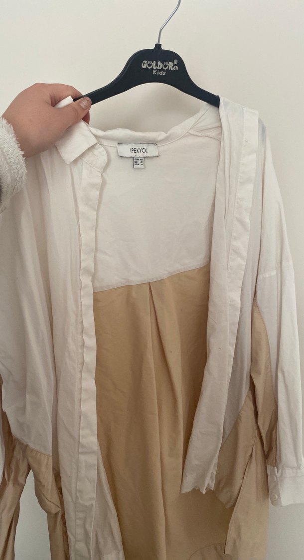 Bej renkli, pamuklu kumaştan yapılmış düğmeli uzun kollu, yakalı ve bol kesim gömlek. Pastel tonlarda, Paris sokak tarzını yansıtır.