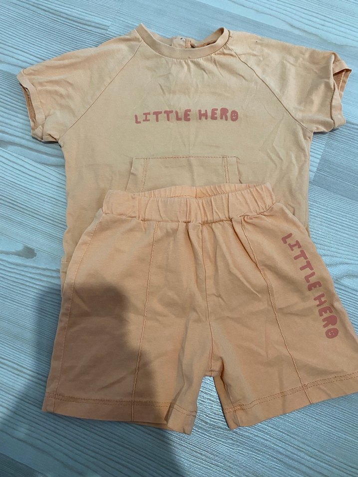 Bej renkli, pamuklu kumaştan yapılmış kısa kollu bisiklet yaka tişört ve şort takımı. "LITTLE HERO" baskılı rahat ve şık sokak stili.