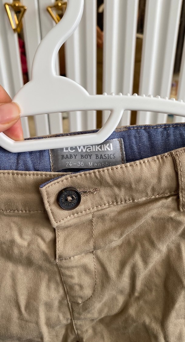 Bej pamuklu, tokalı, normal kesim erkek bebek pantolonu. Günlük kullanıma uygun, desen içermeyen rahat bir modeldir.