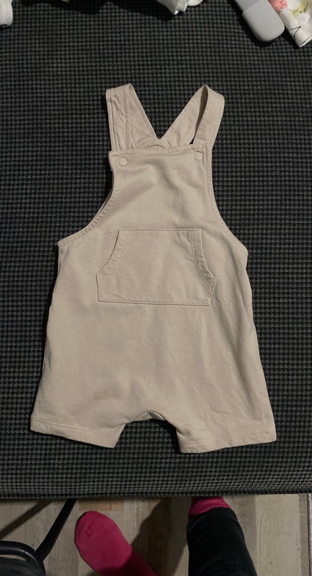 Bej pamuklu askılı erkek çocuk tulumu, rahat kesim ve ön cep detaylıdır, sokak stiline uygundur.