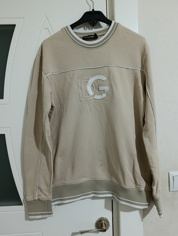 Bej pamuklu sweatshirt, yuvarlak yaka ve uzun kolludur. Gevşek kesimi ve DG logosuyla rahat, şık bir günlük stil sunar.