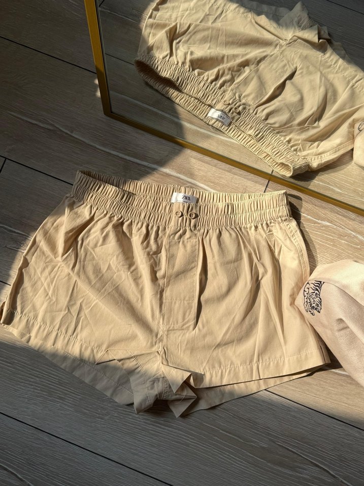 Yumuşak pamuktan, gevşek kesim ve lastikli bel detaylı bej mini şort. Minimalist tarzda, günlük rahat kullanım için uygundur.