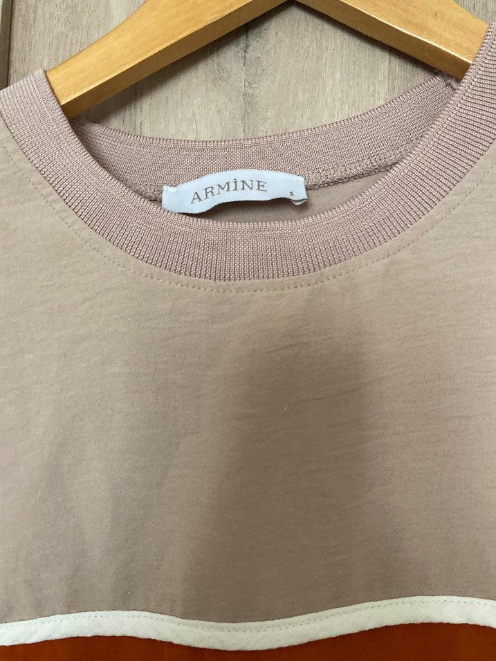Armine marka pamuklu, bej tonlarında, uzun kollu, yuvarlak yaka hamile tişörtü. Salaş kesimi ve baskılı deseniyle günlük kullanıma uygun.