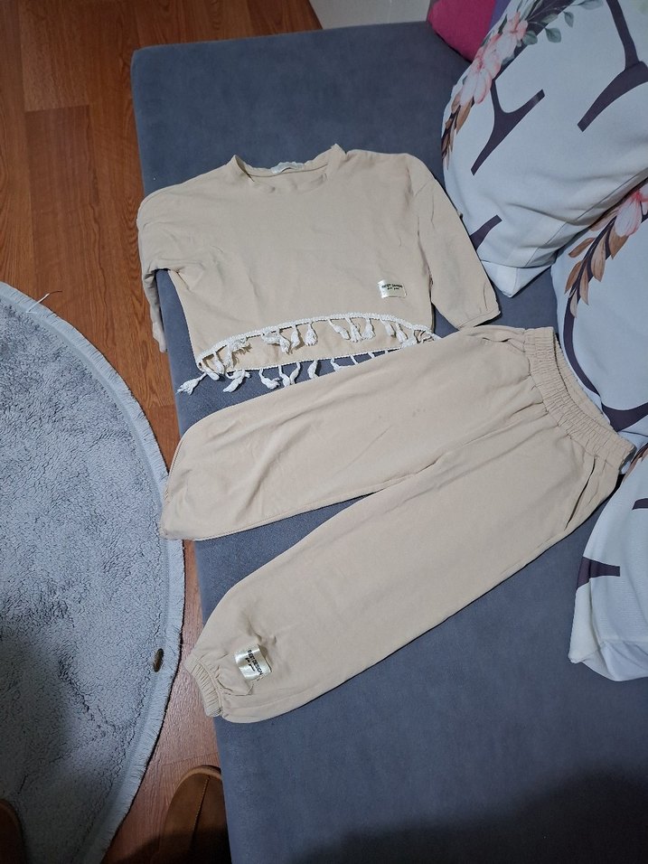 Bej renkli, pamuklu kumaştan kadınlar için bol kesim mini eşofman takımı. Püsküllü uzun kollu üst ve rahat pantolon içerir. ♀️