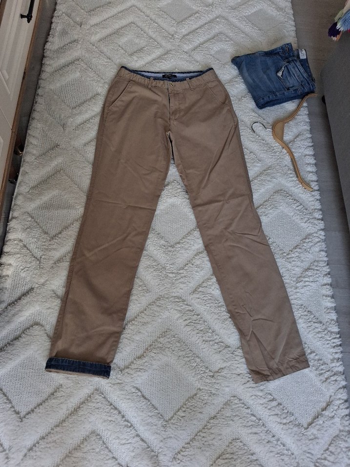Bej pamuklu pantolon, kemerli ve normal kesim. Günlük kullanıma uygun, rahat ve şık sokak tarzı.