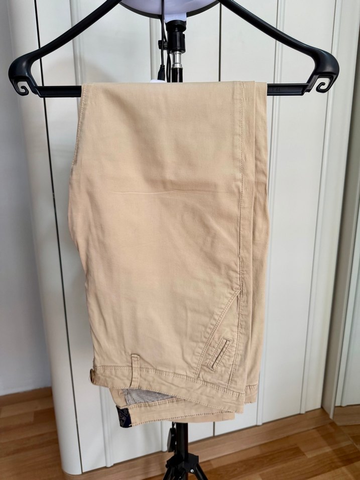 Bej pamuklu erkek pantolon, normal boy ve regular fit. Kemerli, desen yok, günlük rahat kullanım için uygundur.