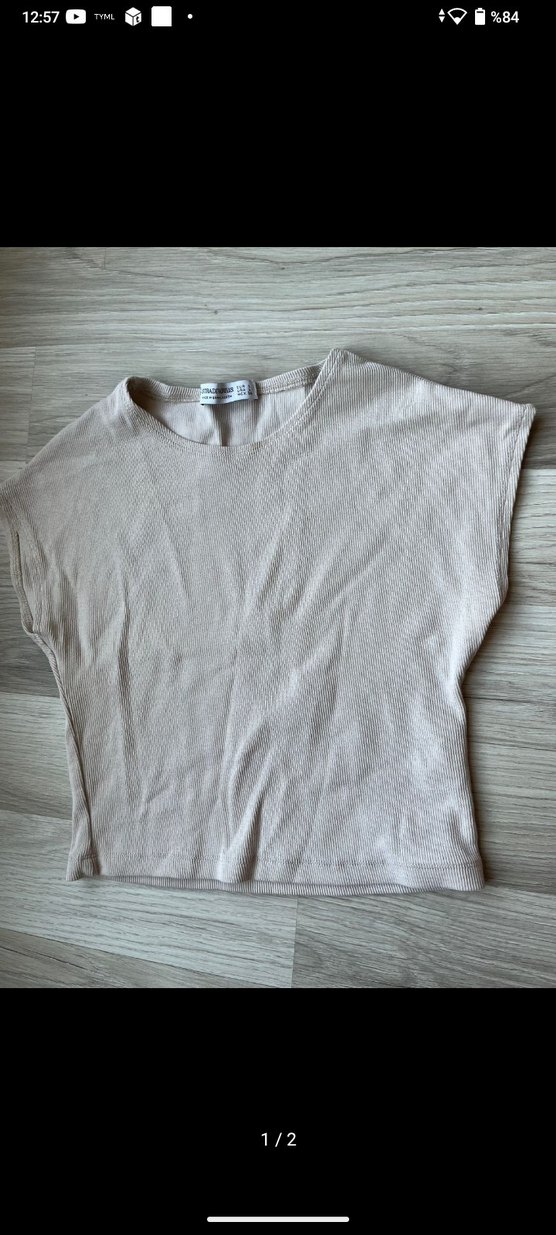 Bej renkli, Pamuklu kısa kollu ve yuvarlak yakalı kadın tişörtü. L ama M bedene de uyar