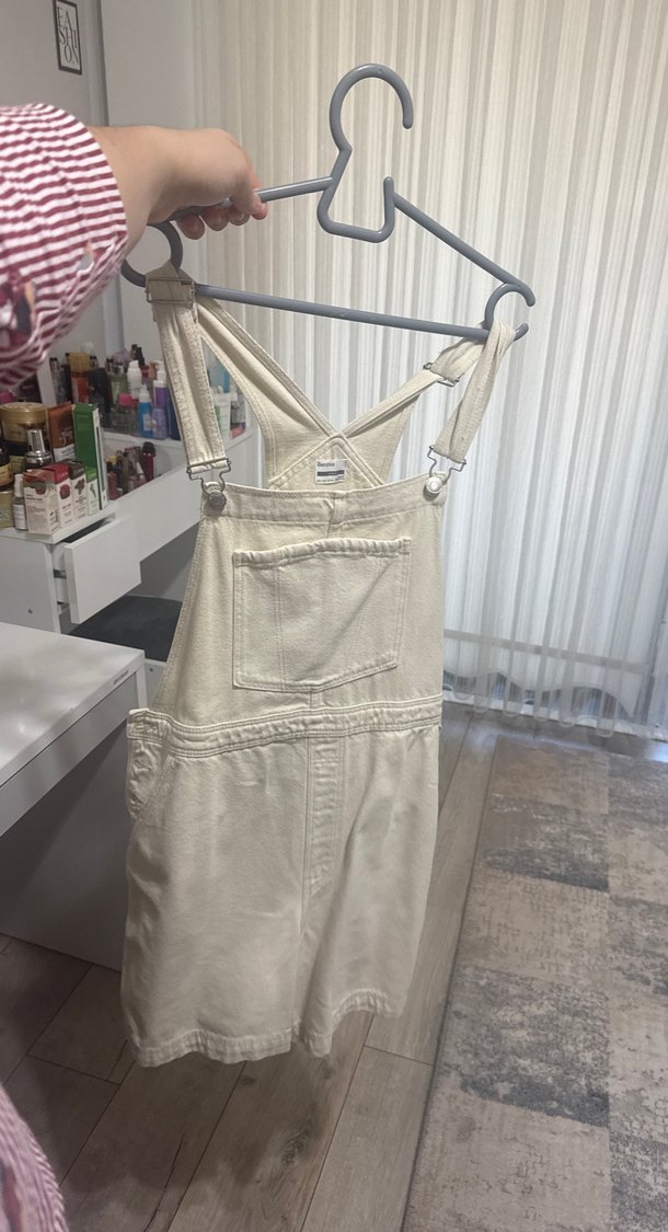 Bej pamuklu midi uzunlukta, bol kesim ve halter yaka askılı kadın şort tulum. Ön cep detaylı, günlük kullanıma uygun rahat ve şık bir parça. Hiç giyilmedi
