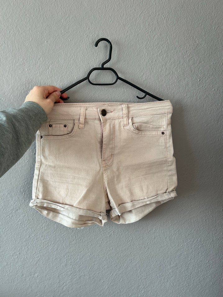 Bej pamuklu mini kot şort, rahat bol kesim ve sokak stili ile günlük kullanıma uygun, zahmetsiz şıklık sunar.