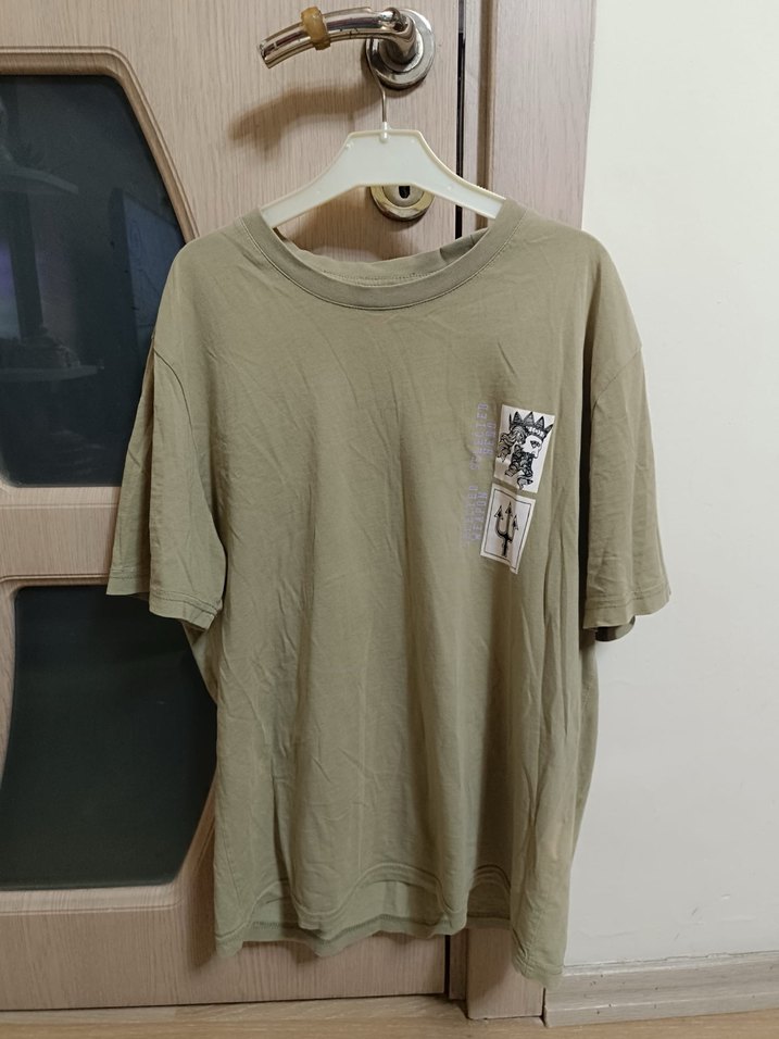 Bej renk, pamuklu, kısa kollu, oversize kesim ve bisiklet yaka tişört. Baskılı detayları ile rahat ve şık günlük kullanım için uygundur.