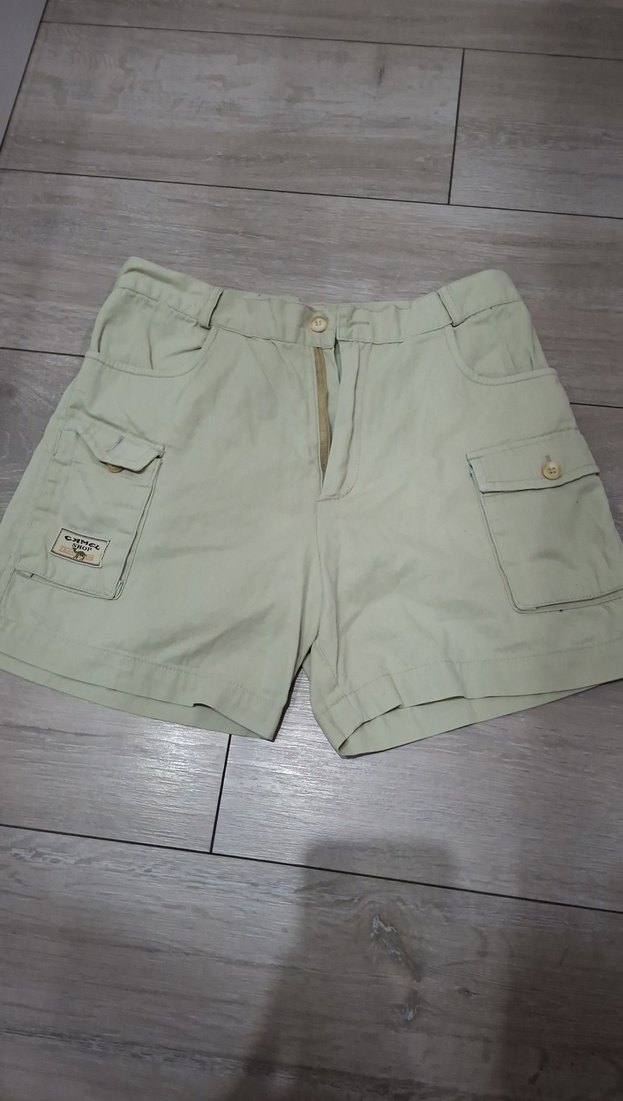 Bej pamuklu, bol kesim erkek şort, ön ceplerle sade ve desensiz tasarıma sahip, rahat sokak stili için uygun. fermuarı yoktur