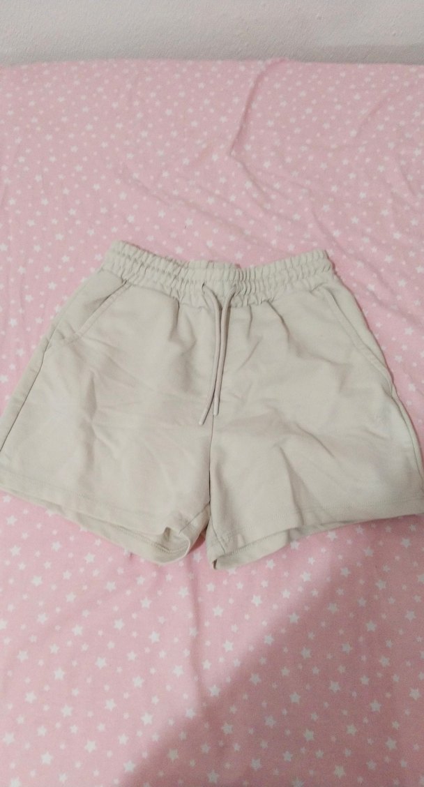 Yumuşak pamuktan yapılmış, bej renkte, elastik bel ve bağcıklı rahat kesim hamile şortu. Günlük kullanıma uygun sade ve desensiz tasarım.